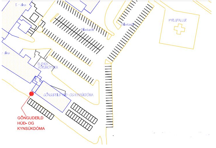 Örvarnar sýna leiðina frá göngudeild húð- og kynsjúkdóma í blóðrannsókn. Gengið er inn um Krókinn, aðalinngang Landspítala í Fossvogi. Þegar þangað er komiðer farið beint áfram að rannsóknarkjarna (E1 er til vinstri).