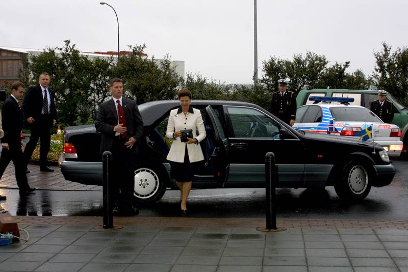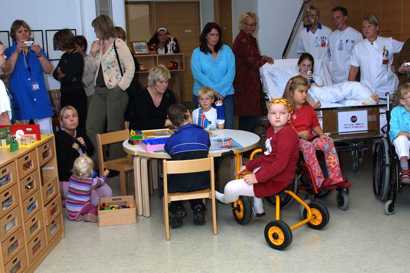 Sylvía Svíadrottning skoðaði Barnaspítala Hringsins í dag, á fyrsta degi opinberrar heimsóknar sænsku konungshjónanna og dóttur þeirra til Íslands. Dorrit Moussaieff forsetafrú var í för með drottningu og með þeim fjölmennt fylgdarlið aðstoðarmanna og fjölmiðlafólks. Jóhannes M. Gunnarsson forstjóri LSH, Anna Stefánsdóttir framkvæmdastjóri hjúkrunar og sviðsstjórar barnasviðs, Ásgeir Haraldsson og Magnús Ólafsson tóku á móti gestunum, gengu um húsið með þeim og sögðu frá starfseminni.