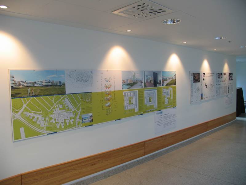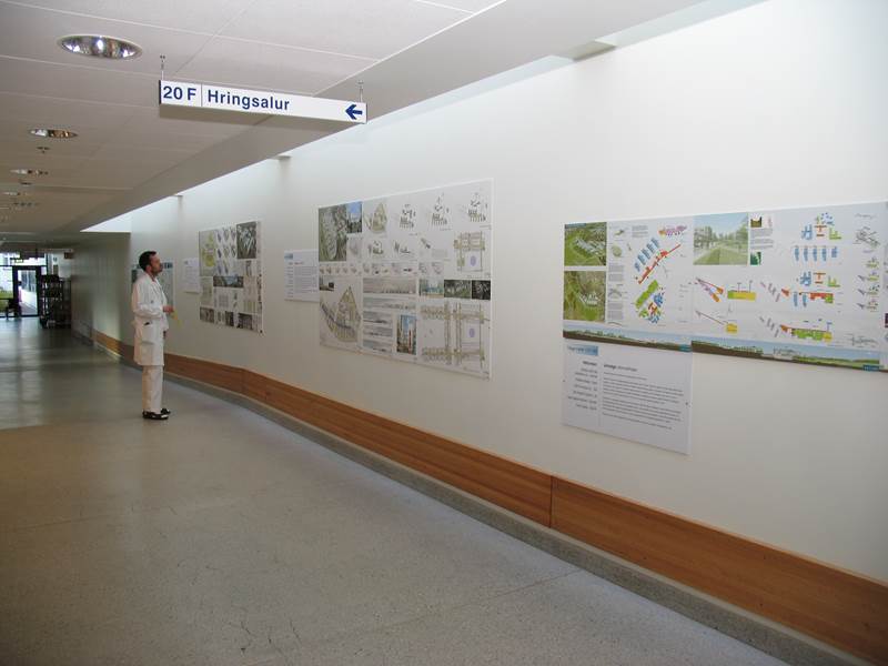 Framan við Hringsal hafa verið hengd upp veggspjöld með tillögunum sjö í samkeppninni um deiliskipulag á lóð LSH við Hringbraut vegna byggingar nýs spítala þar.
