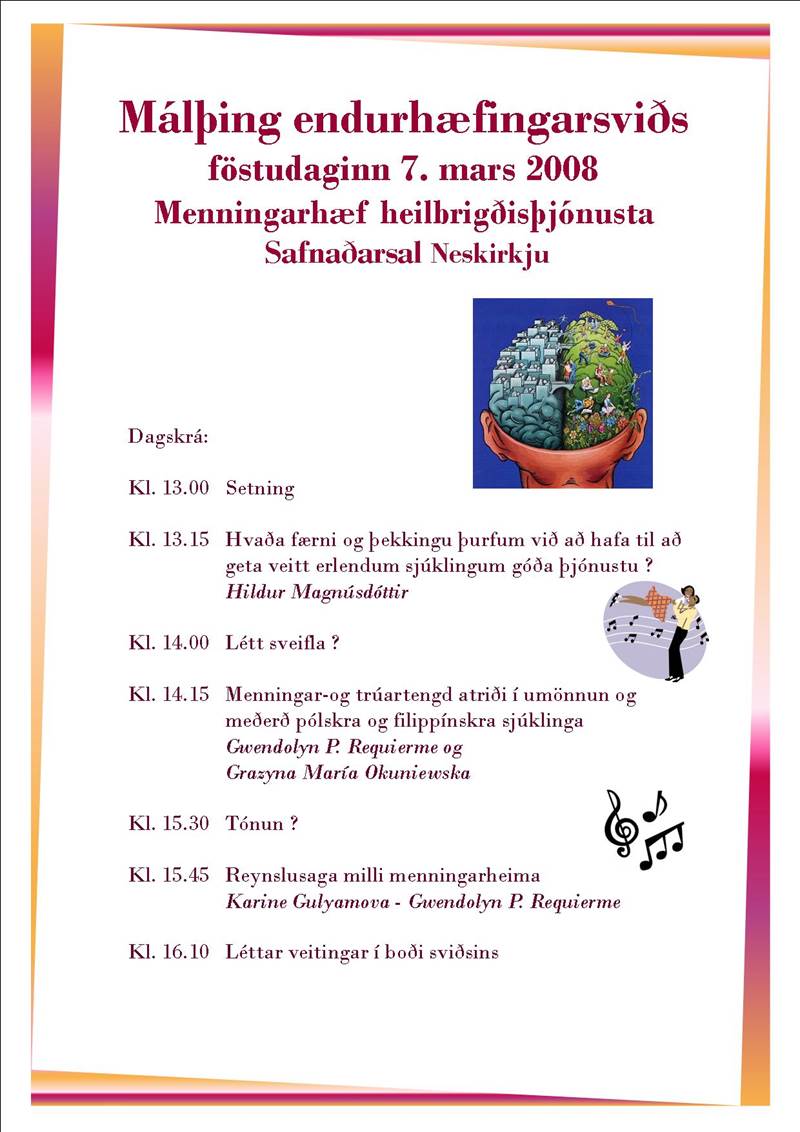 Menningarhæf heilbrigðisþjónusta var yfirskrift vel heppnaðs málþings sem endurhæfingarsvið hélt fyrir starfsmenn sviðsins föstudaginn 7. mars 2008. Í hléum var annars vegar taktviss liðkun eftir tónlist frá 7 þjóðlöndum og hins vegar sungið á 10 tungumálum. Rúmlega 100 starfsmenn mættu og þótti þingið sem þótti bæði mjög gagnlegt og skemmtilegt.