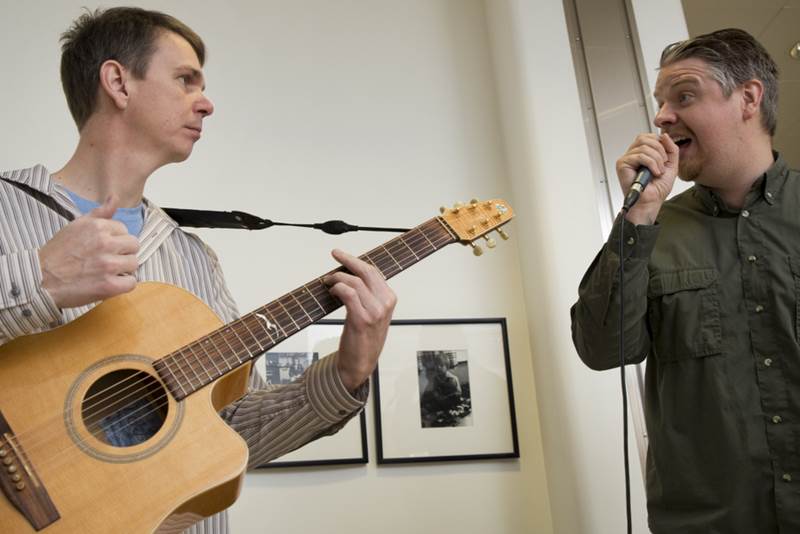 Heiðar Örn og Þröstur sungu nokkur lög fyrir börnin í tengslum við bók Agnesar.