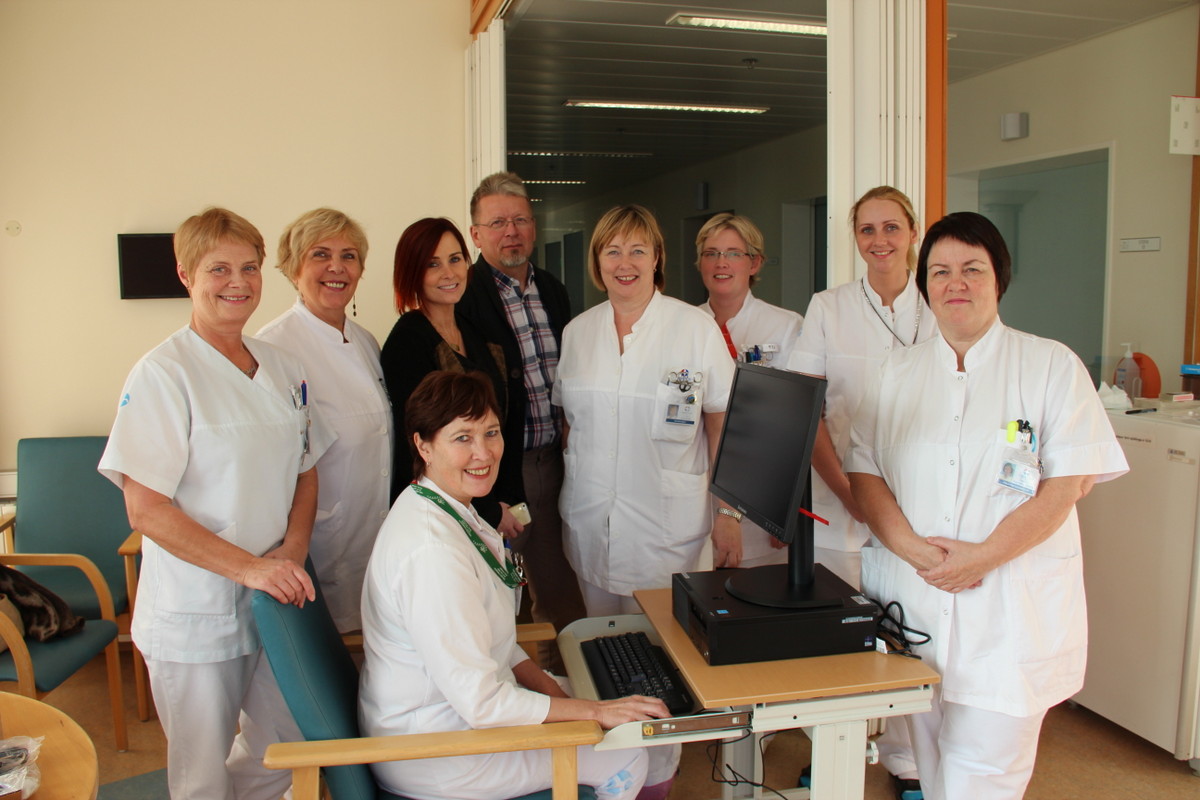 Stómasamtök Íslands gáfu skurðlækningadeild 12G tölvu fyrir sjúklinga í október 2014 - Ingibjörg Guðmundsdóttir sjúkraliði, Margrét Ólafsdóttir sjúkraliði, Eva Bergmann stjórnarmaður og Jón Þorkelsson formaður Stómasamtakanna, Elín María Sigurðardóttir deildarstjóri, Guðrún Jóna Sigurðardóttir stómahjúkrunarfræðingur, Kristrún Skarphéðinsdóttir hjúkrunarnemi og Oddfríður R. Jónsdóttir stómahjúkrunarfræðingur. Við tölvu er Jakobína Stefánsdóttir sjúkraliði.
