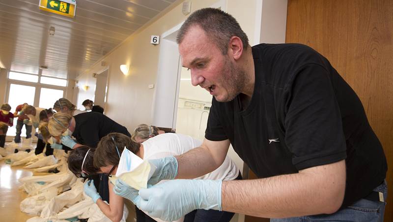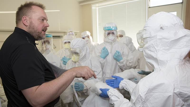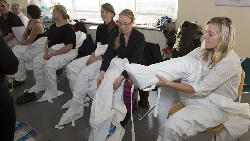Mynd: Viðbragðsteymi Landspítala á námskeiði vegna undirbúnings fyrir ebólu 31. október 2014. Allir fullklæddir