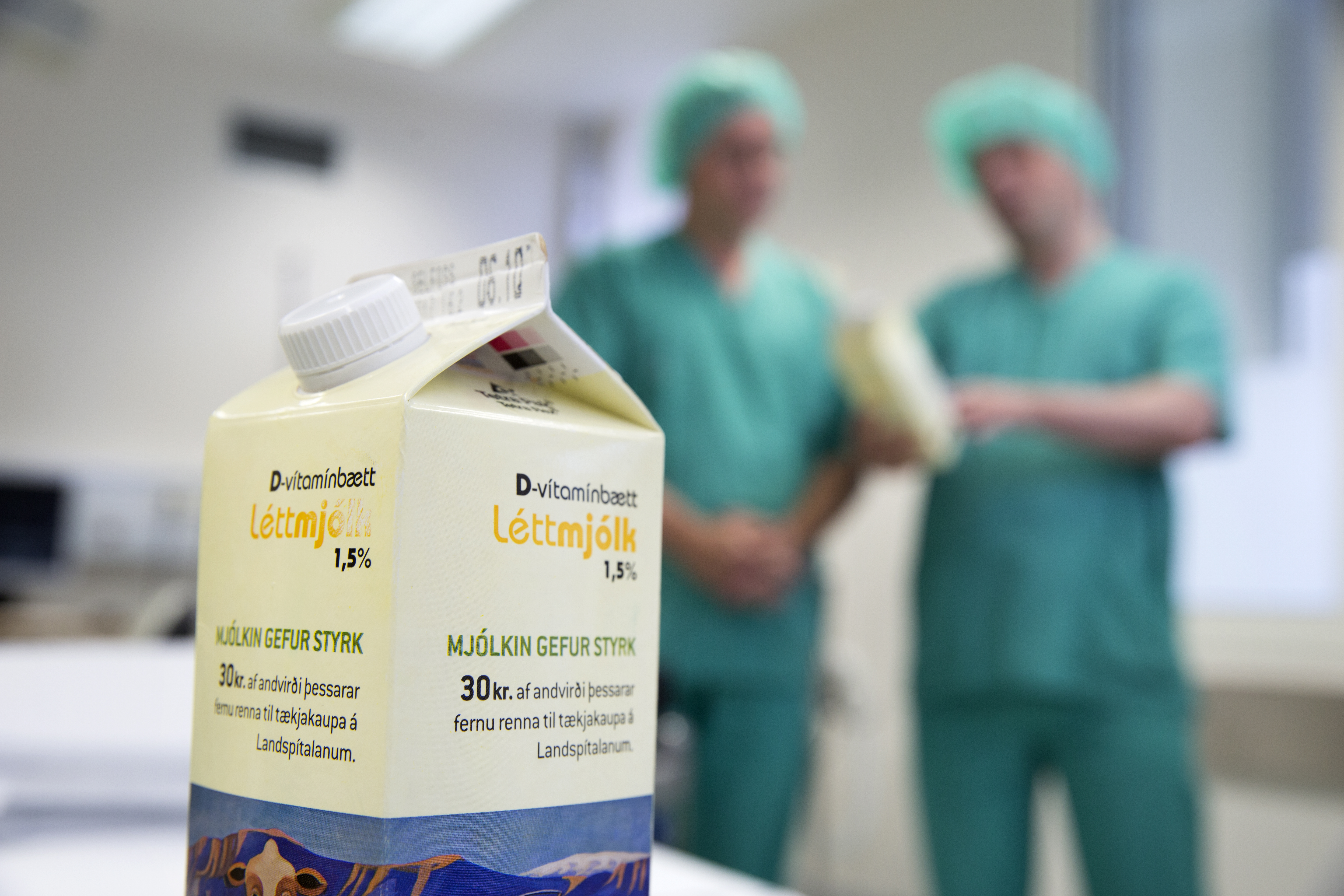 Hér neðan eru eru myndir frá því þegar Ari Edwald, forstjóri MS, afhenti Páli Matthíassyni, forstjóra Landspítala, fyrstu fernuna á einni skurðstofu spítalans í dag.