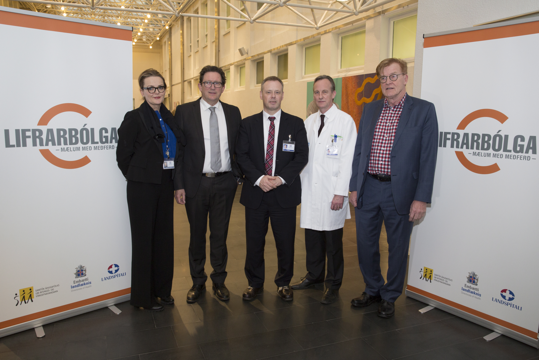 Átak til að útrýma lifrarbólgu C formlega hafið - María Heimisdóttir, framkvæmdastjóri fjármálasviðs á Landspítala, Kristján Þór Júlíusson heilbrigðisráðherra, Páll Matthíasson forstjóri Landspítala, Sigurður Ólafsson, sérfræðilæknir á Landspítala, og Þórarinn Tyrfingsson, forstjóri Sjúkrahússins Vogs.
