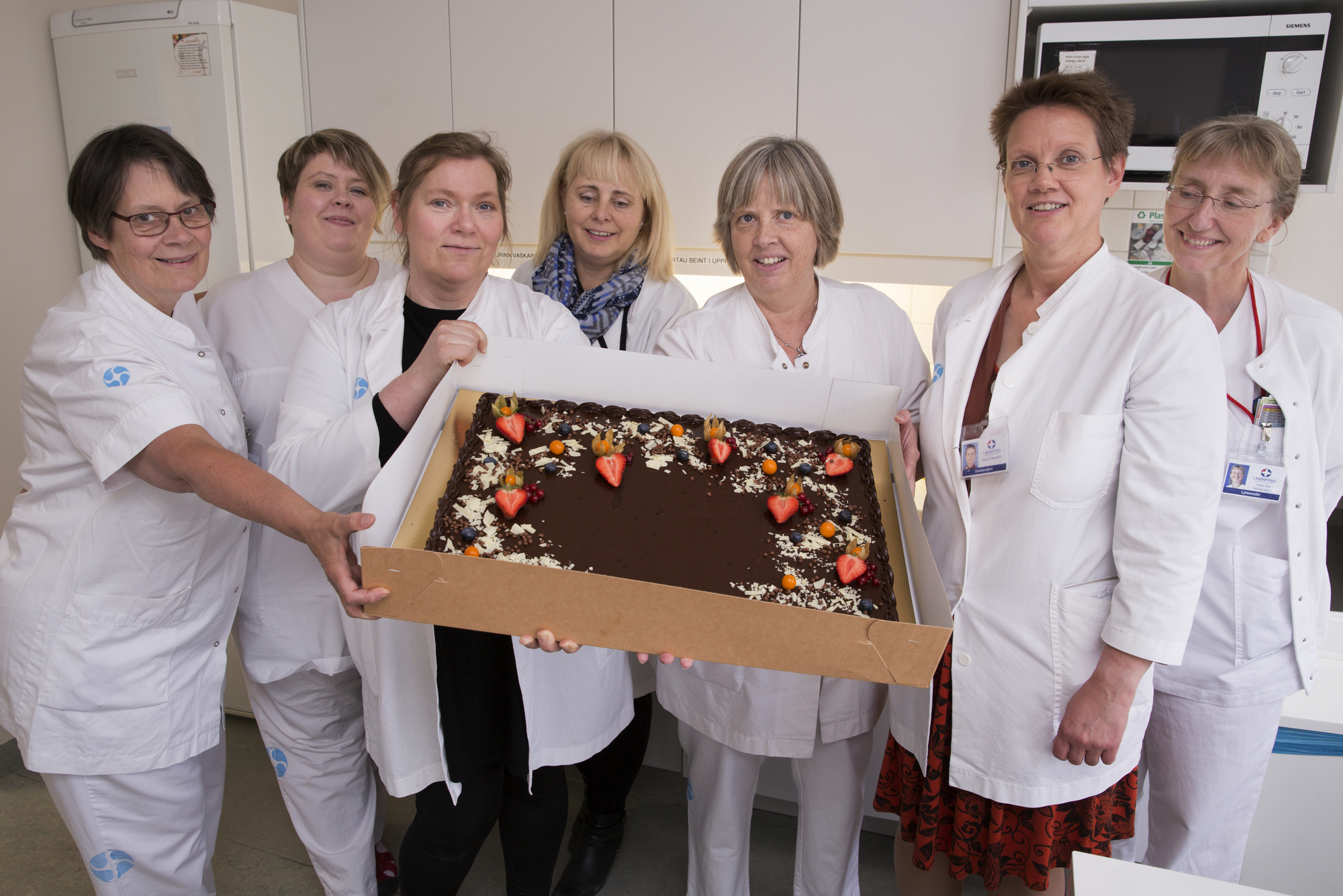 Vökudeild 23D fékk tertu í boði Bakarameistarans fyrir framúrskarandi fylgni við reglur Landspítala um skart á höndum.