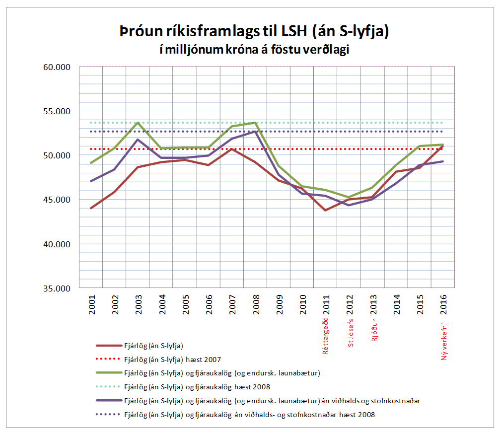 Samkvæmt McKinsey skýrslunni eru útgjöld við hverja framleidda þjónustueiningu á Landspítala u.þ.b. 50% lægri en á sænskum samanburðarsjúkrahúsum (að teknu tilliti til gengis og verðlagsmunar). Þessi munur er slíkur að það ætti ekki að vekja furðu stjórnvalda að hér vanti meira fé. Enn fremur liggur fyrir að ríkisframlag til rekstrar Landspítala var á árinu 2016 3,4 milljörðum lægra, á föstu verðlagi, en árið 2008. Á tímabilinu jókst eftirspurn stórlega enda fjölgaði þjóðinni um 5,4% og eldri borgurum (67 ára og eldri) um 26% samkvæmt gögnum Hagstofu. Einnig voru sjúkrahúsinu á þessu tímabili falin stóraukin verkefni.Tæplega 10% niðurskurðarkrafa