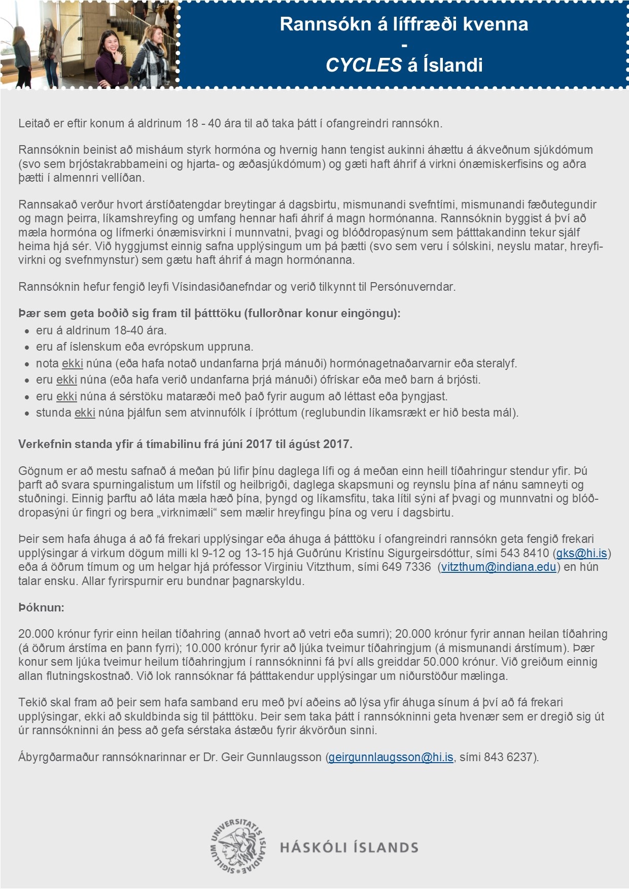 Þeir sem hafa áhuga á að fá frekari upplýsingar eða hafa áhuga á þátttöku í ofangreindri rannsókn geta fengið frekari upplýsingar hjá Guðrúnu Kr, verkefnastjóra RÍN (gks@hi.is - 543 8410) eða prófessor Virginia Vitzthum (vitzthum@indiana.edu - 649 7336).
