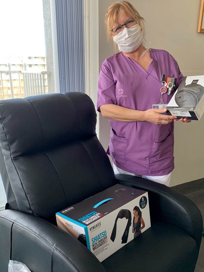 Tíu legudeildir í Fossvogi fengu rafknúinn hægindastóll, hjóðeinangrandi heyrnatól af bestu gerð, nuddtæki og þyngingarteppi, allt hugsað til að gera stutta hvíld og slökun aðgengilega á vaktinni og taka orkublundi á næturvaktinni.