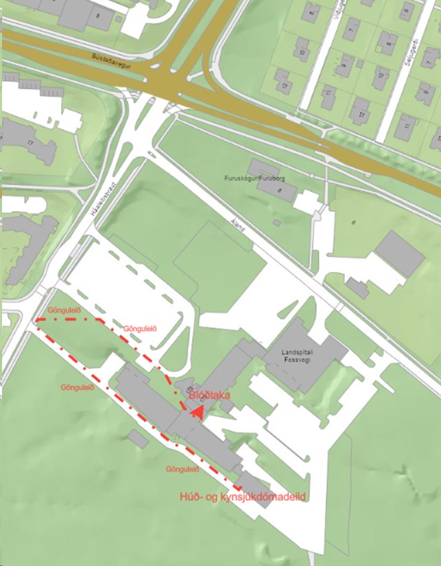 Örvarnar sýna leiðina frá göngudeild húð- og kynsjúkdóma í blóðrannsókn. Gengið er inn um Krókinn, aðalinngang Landspítala í Fossvogi. Þegar þangað er komiðer farið beint áfram að rannsóknarkjarna (E1 er til vinstri).
