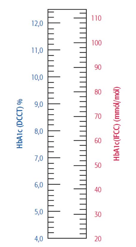 - HbA1c (eldra gildi) (%) = (0,0915 *HbA1c nýtt gildi (mmól/mól) ) + 2,15