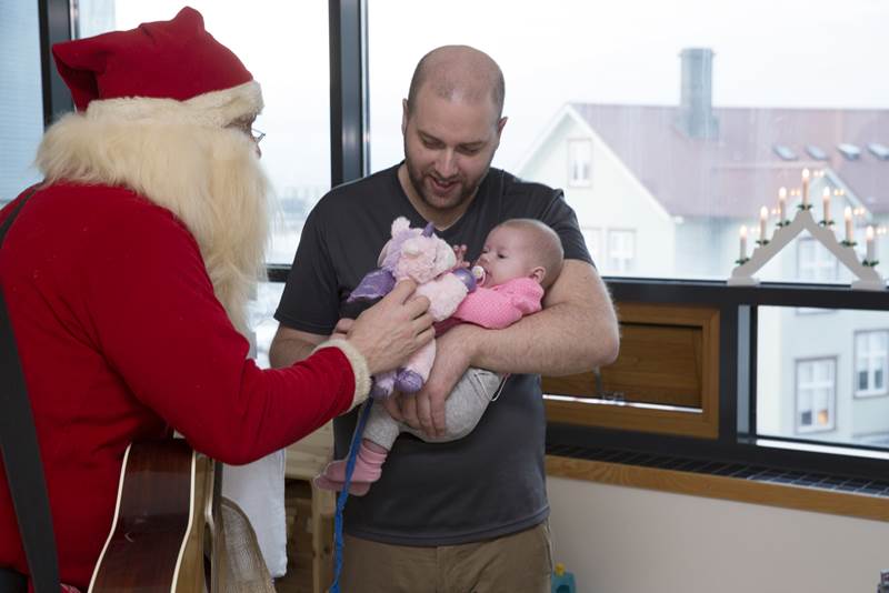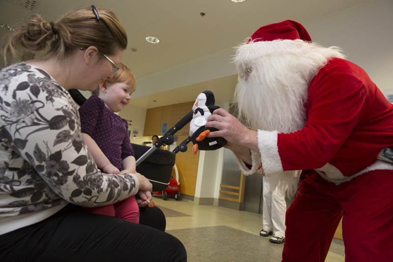 Margir koma til dæmis þangað og á aðrar deildir barnaspítalans í heimsókn til að gleðja börnin með gleði og söng og færa gjafir. Sumir gestanna eru í rauðum búningum með hvítt skegg!