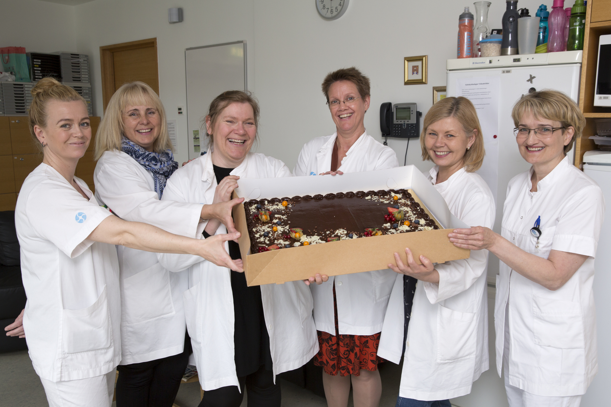 Vökudeild 23D fékk tertu í boði Bakarameistarans fyrir framúrskarandi fylgni við reglur Landspítala um skart á höndum.