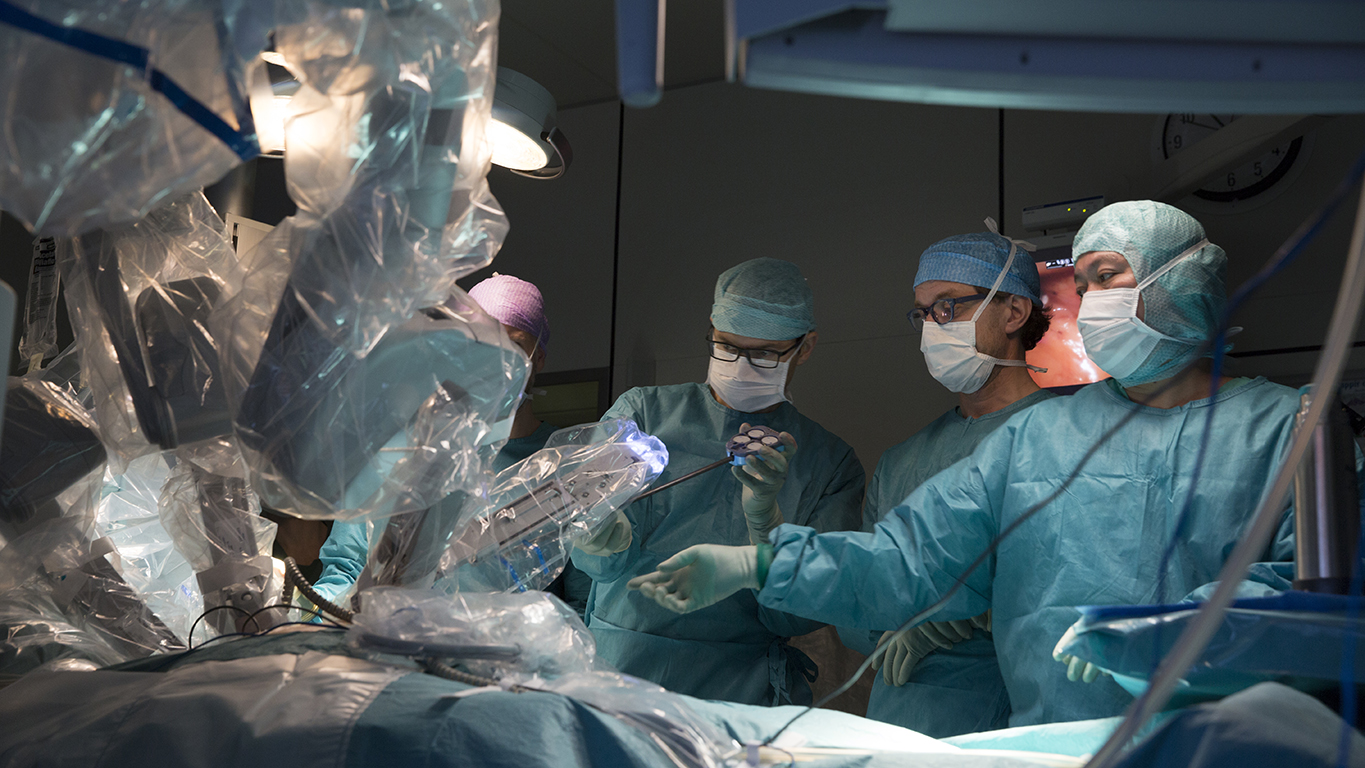 Arnar Geirsson framkvæmir hjáveituaðgerð með aðstoð aðgerðarþjarka á Landspítala. Til aðstoðar eru Tómas Guðbjartsson og Niel K. Mamlias skurðhjúkrunarfræðingur.