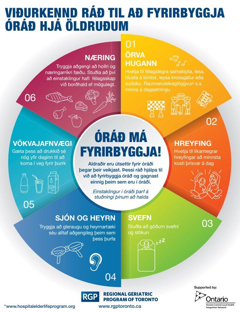 Á vefsíðunni „Óráð er óráð“ á vef Landspítala má finna ýmis „verkfæri“ og fróðleik um óráð. Vakin er athygli á henni í tengslum við alþjóðavitundarvakningardaginn um óráð sem er 15. mars. Á vefsíðunni eru veggspjöld um óráð. Veggspjaldið sem sýnt er hér fyrir neðan lýsir viðurkenndum ráðum til að fyrirbyggja óráð hjá öldruðum.